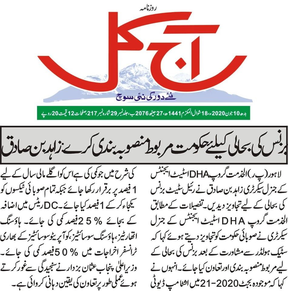الخدمت گروپ DHAاسٹیٹ ایجنٹس کے چیئرمین طلعت احمد میاں اورجنرل سیکٹری زاہد بن صادق نے صوبائی حکومت کو بھجوائی گئی خصوصی تجاویز میں کہا کہ رئیل اسٹیٹ بزنس گزشتہ چار سال سے بحران کا شکار ہے اور موجودہ وباء کی وجہ سے رئیل اسٹیٹ کا شبہ سب سے زیادہ متاثر ہو ا ہے