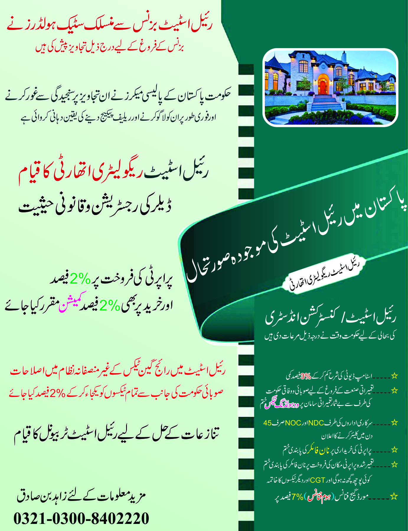 رئیل اسٹیٹ بزنس سے منسلک سٹیک ہولڈرز نے بزنس کے فروغ کے لیے درج ذیل تجاویز پیش کی ہیں